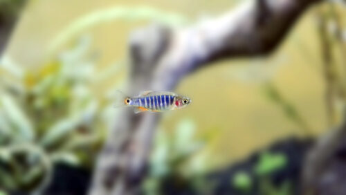 The Emerald Dwarf Rasbora is a tiny fish hence the genus Micro! Don’t let this macro lens picture fool you. They are not even an inch long when full-grown. Although it is placed in the genus Microrasbora, that may likely change because it has been discovered that they are more closely related to danios than rasboras. This is not a common fish, and it’s beauty and interesting behavior make it a desireable fish to look for. It is a pinkish-orange colored fish with up to 15 emerald green bars along its sides. There is a small black spot at the base of the caudal fin. Males have reddish-orange in their fins, while females have just clear fins and are less colorful.